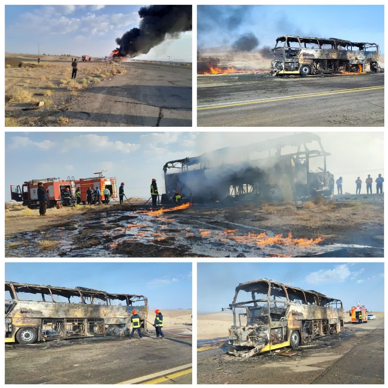 بامداد امروز یک دستگاه اتوبوس که از سمت مشهد عازم زابل بود در کیلومتر ۸ محور نهبندان – شوسف دچار حریق شد.