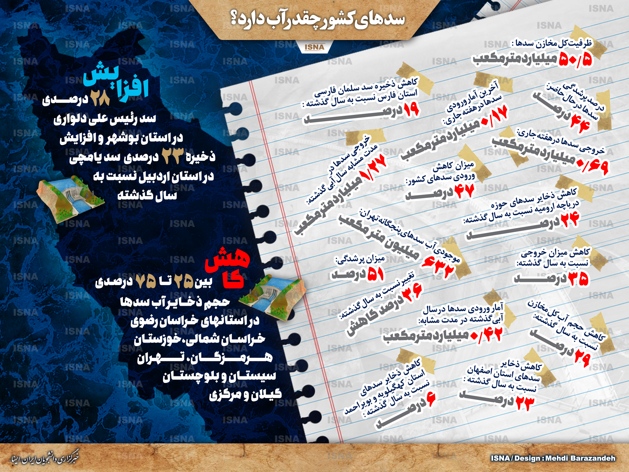 به گزارش پایگاه خبری حامیان سلامت و ایمنی نیروی کار به نقل از ایسنا ، آخرین گزارشها درباره میزان آب سدهای ایران نشان میدهد با وجود اینکه ظرفیت کل مخازن سدها ۵۰.۵ میلیارد مترمکعب است، در حال حاضر ۴۴ درصد این ظرفیت پر شده است. میزان ورودی سدهای کشور نسبت به سال گذشته ۴۷ درصد کاهش و میزان خروجی نیز ۳۵ درصد کاهش داشته و علاوه بر این، حجم آب کل مخازن نیز نسبت به سال گذشته ۲۹ درصد کمتر شده است.
