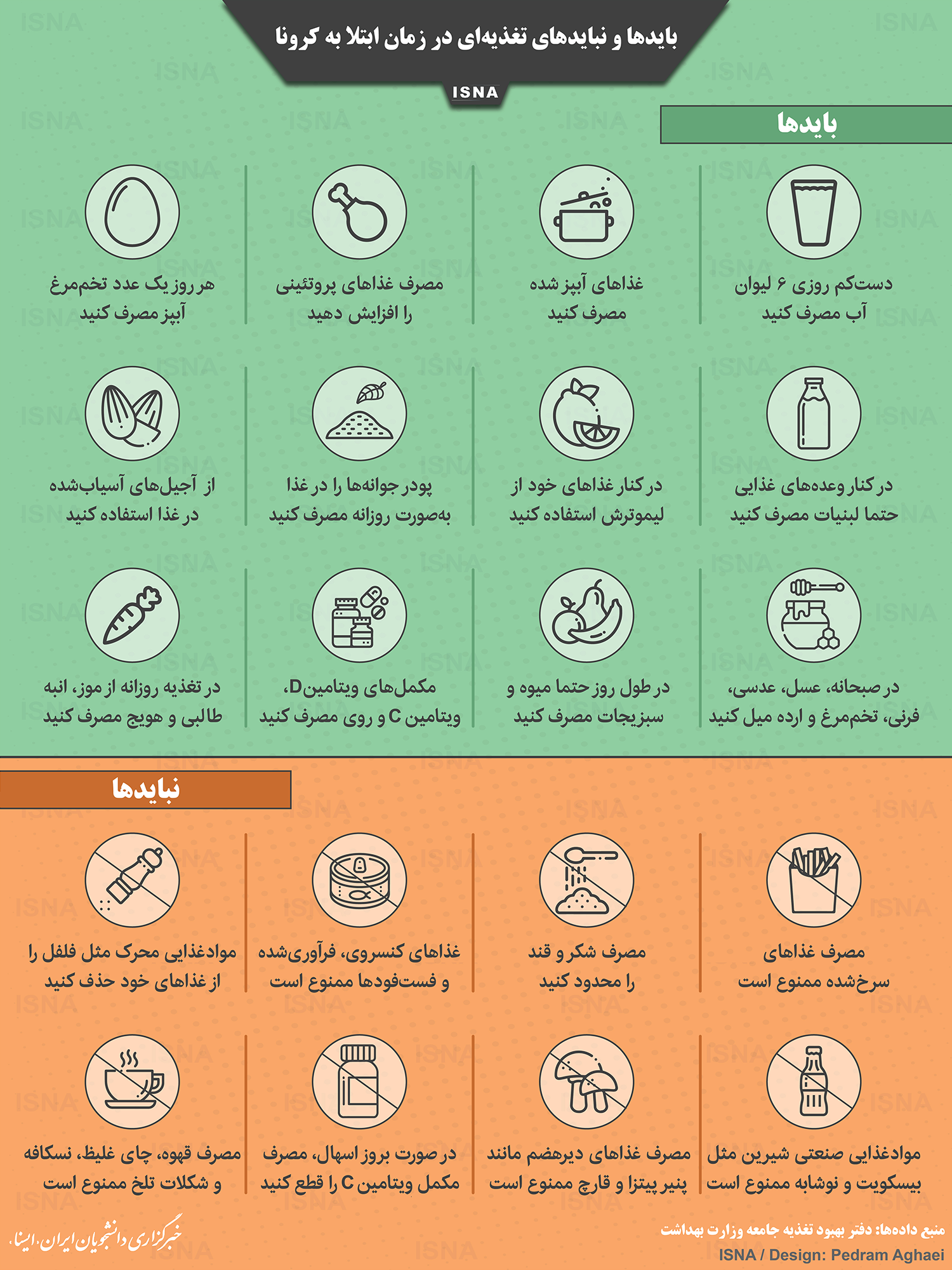 به گزارش پایگاه خبری حامیان سلامت و ایمنی نیروی کار به نقل از ایسنا ، در شرایط شیوع کرونا در کشور، در صورت ابتلا به کووید-۱۹، رعایت برخی نکات تغذیهای بسیار مهم است؛ چراکه با تغذیه مناسب میتوانید سیستم ایمنی بدنتان را تقویت کنید. در این اینفوگرافیک به بایدها و نبایدهای تغذیهای در زمان ابتلا به کرونا اشاره شده است.