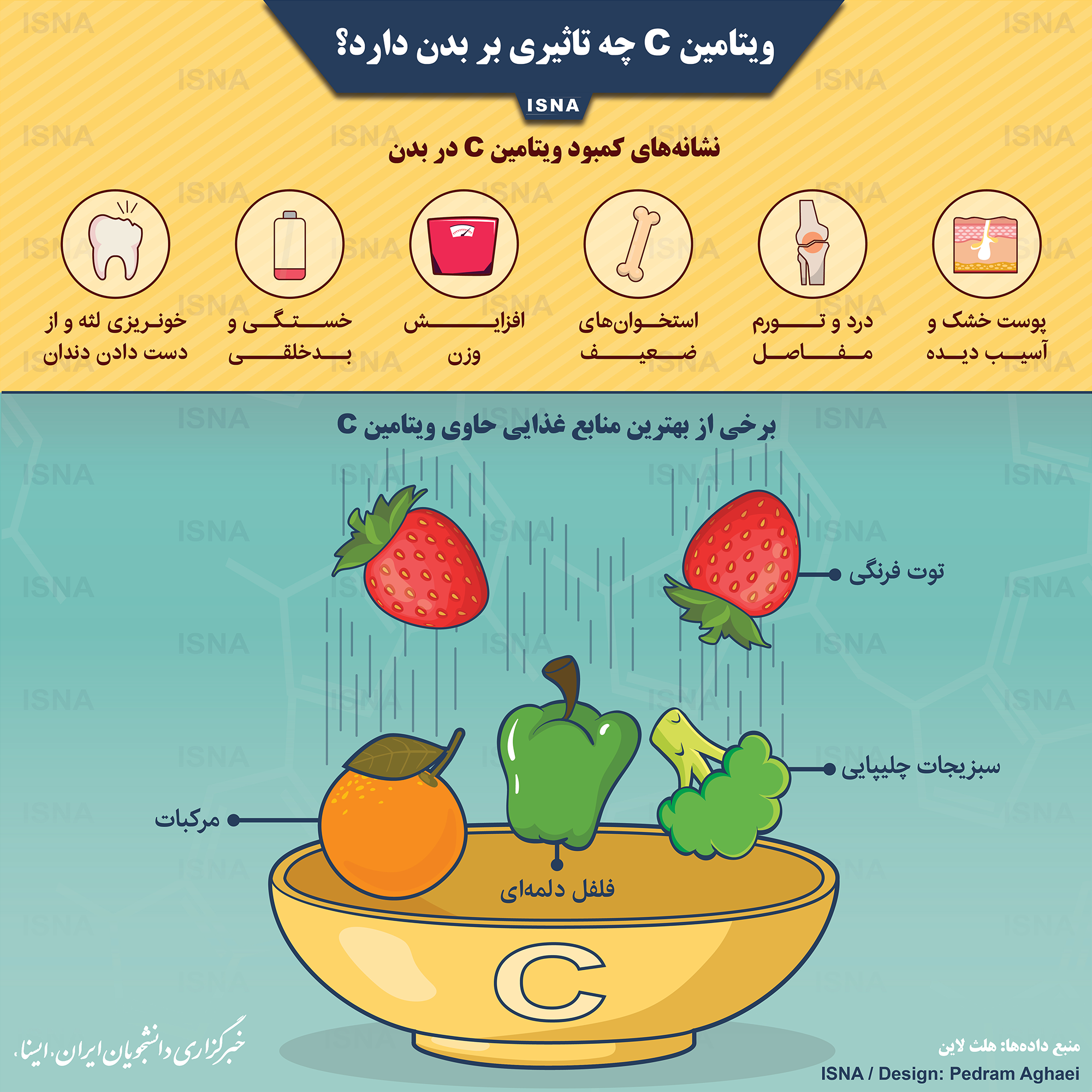به گزارش پایگاه خبری حامیان سلامت و ایمنی نیروی کار به نقل از ایسنا ، دریافت ویتامین C برای بدن انسان ضروری است. به منظور جلوگیری از کمبود این ویتامین باید خوراکیهای حاوی آن، به طور منظم مصرف شوند. به گفته متخصصان، نیاز روزانه ویتامین C برای مردان ۹۰ میلیگرم و برای زنان ۷۵ میلیگرم است. به افرادی که سیگار میکشند نیز توصیه میشود روزانه ۳۵ میلیگرم بیشتر از سایر افراد ویتامین C مصرف کنند. در این اینفوگرافیک به علائم کمبود ویتامین C و برخی از منابع تامینکننده آن اشاره شده است.